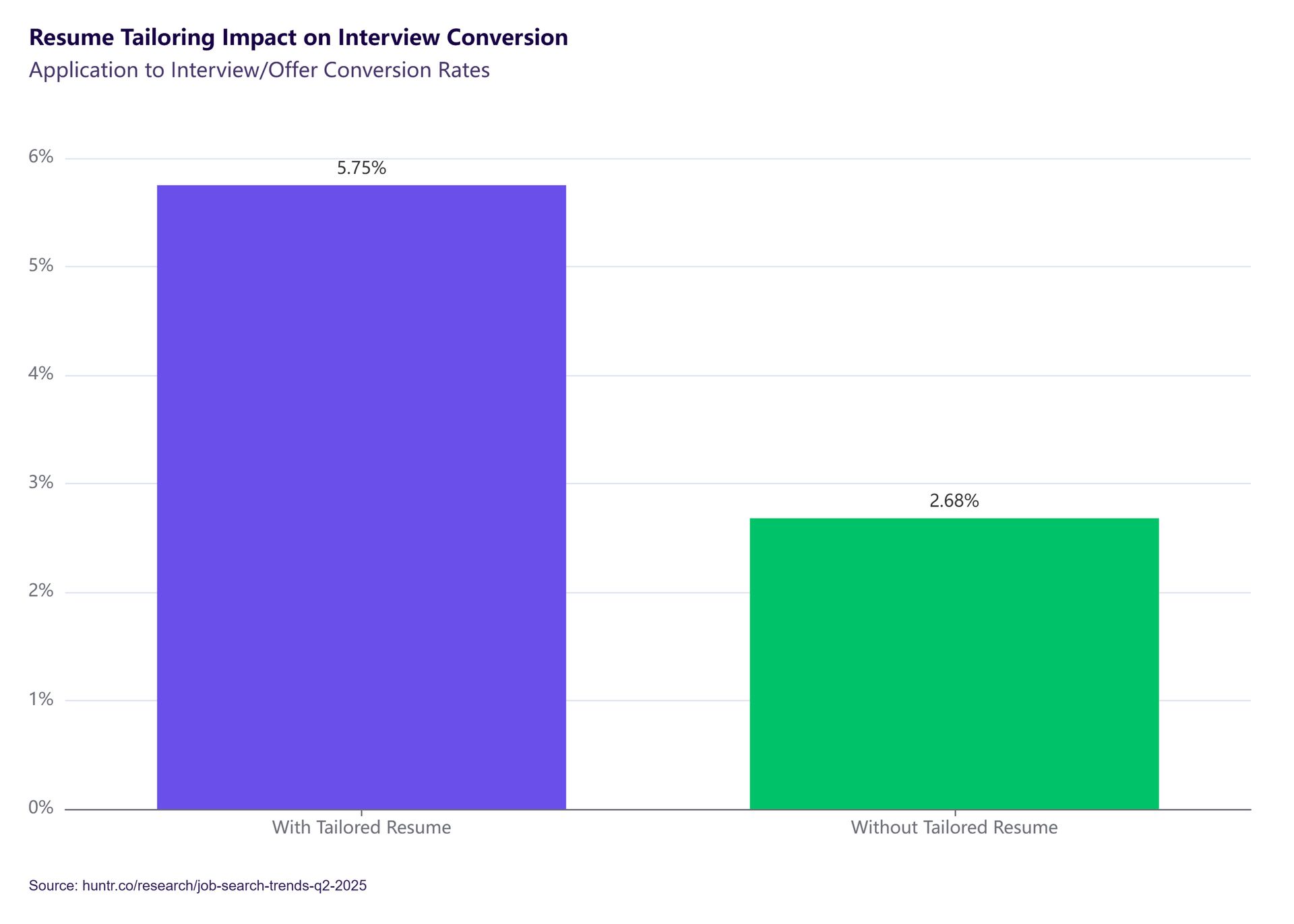 The data is undeniable: Candidates who tailored their resume to the specific job description received 2.1x more interviews than those who didn't (5.75% vs 2.68% conversion rate).