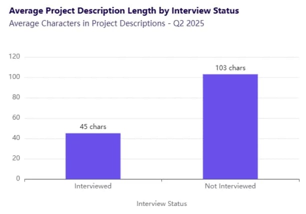 Candidates who failed to get an interview wrote project descriptions averaging 103 characters (long, wordy explanations).